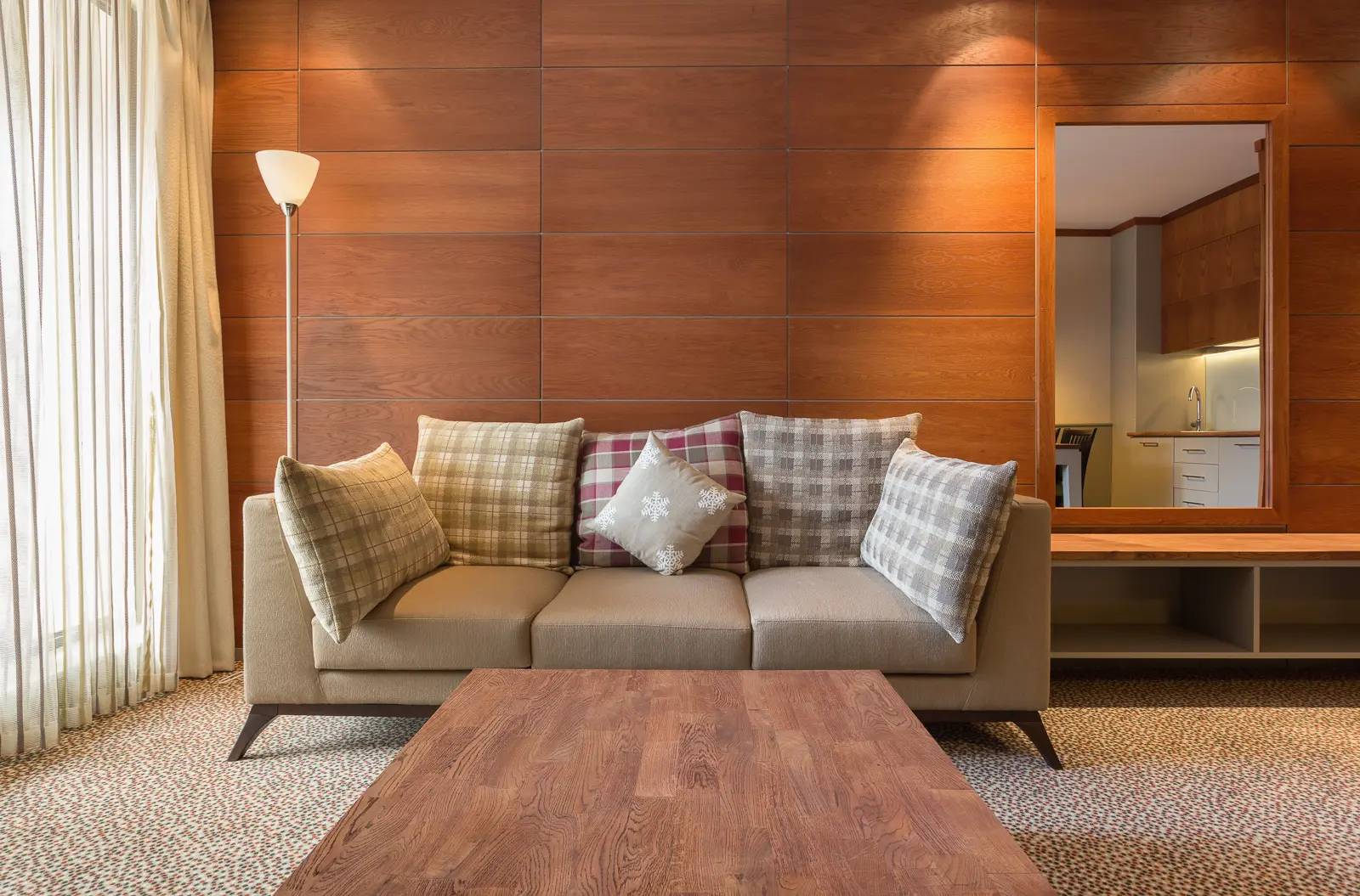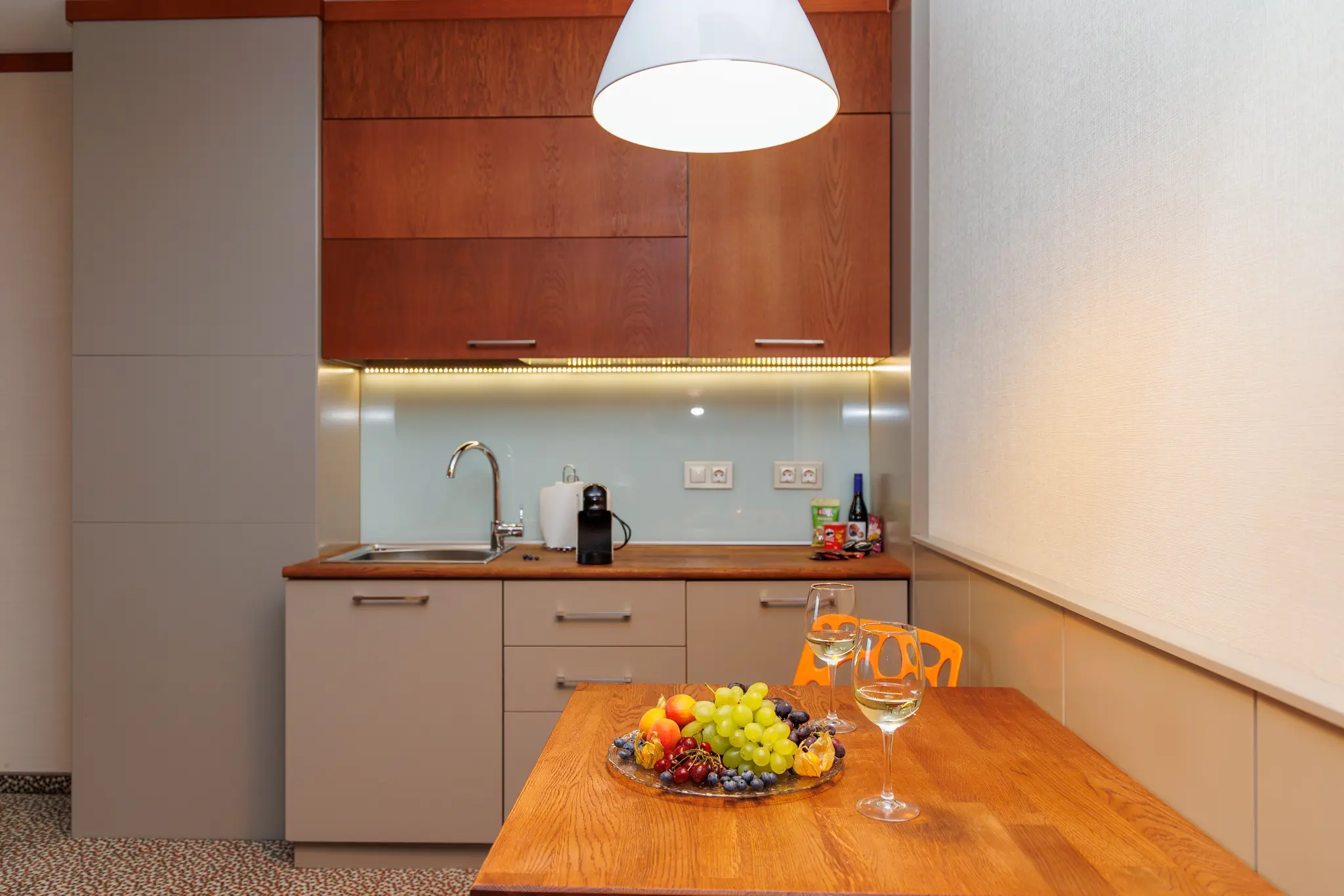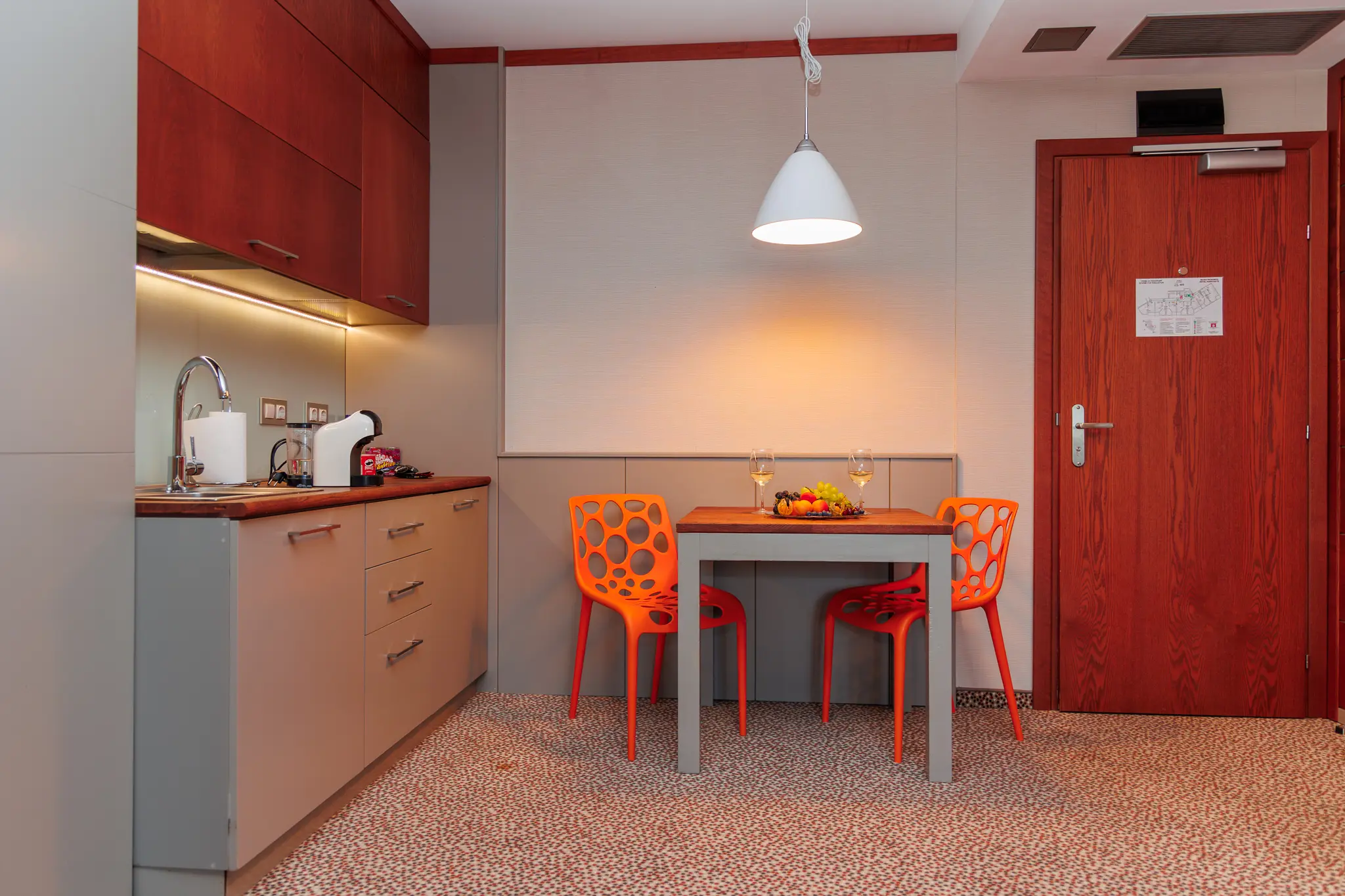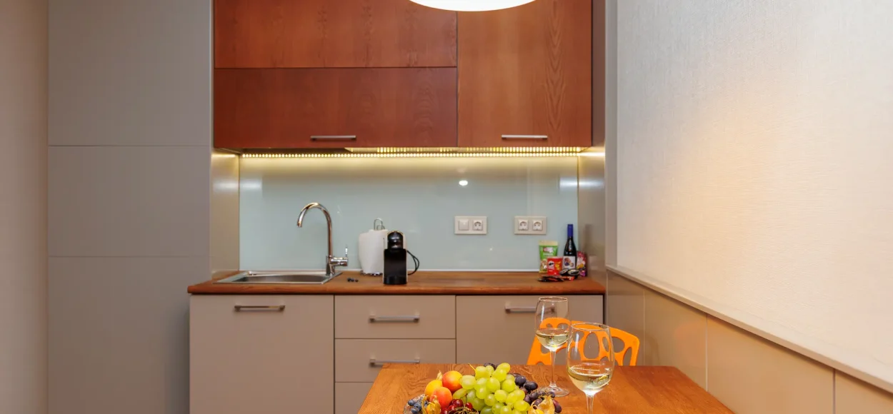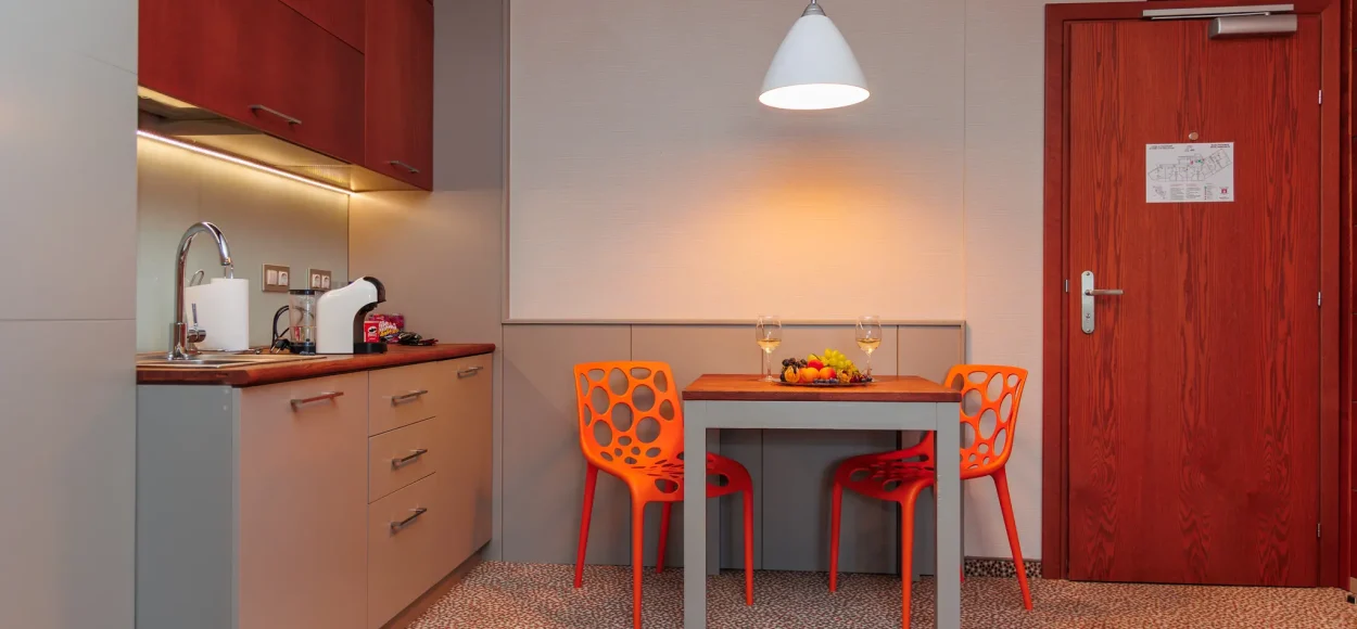 The spacious living room has a triple sofa, dining table and kitchenette with coffee machine, electric kettle, minibar, cups, plates and cutlery. A microwave is also provided upon request at no extra charge.
