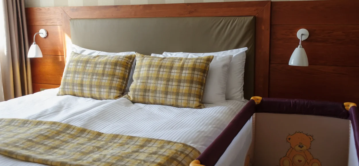 The bedroom is furnished with a large bed or twin beds, wardrobe with built-in safe and bedside tables. A cot is available upon request at no extra charge.