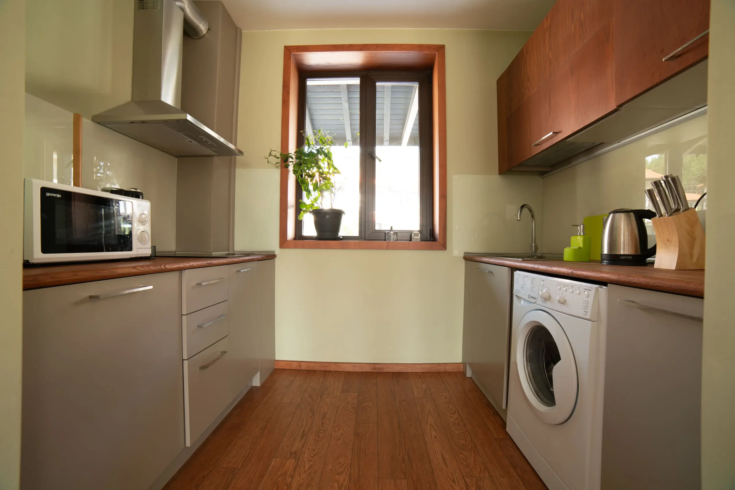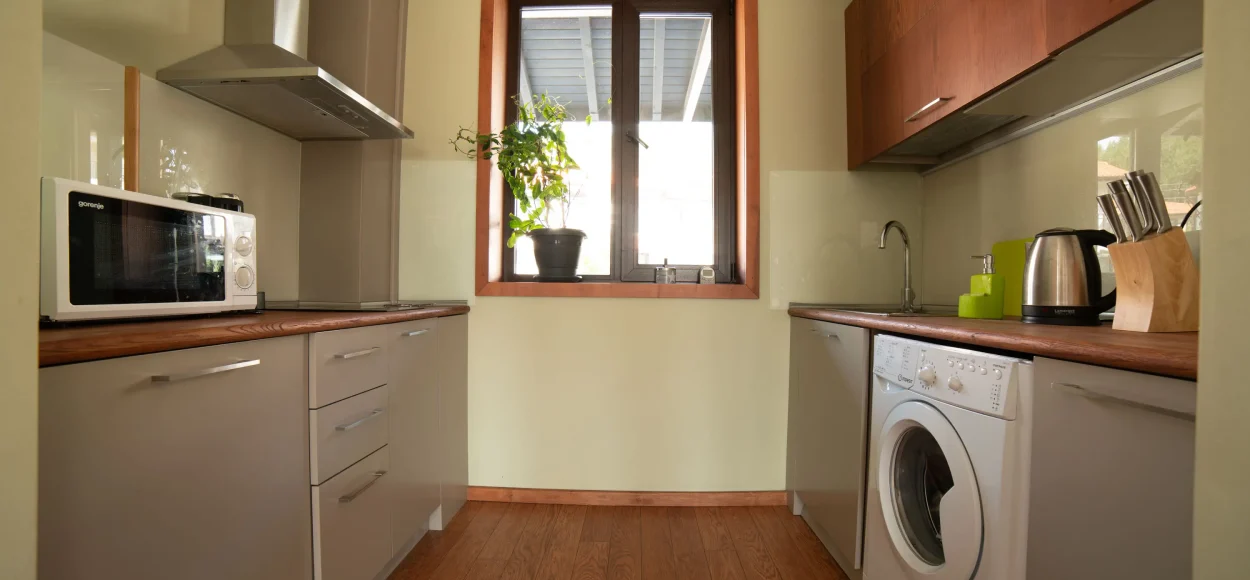 The kitchenette is equipped with everything you need for cooking: plates, glasses, cutlery, fridge and minibar. Only at Villa Familia Lux, guests can use the ceramic cooking hobs, washing machine and microwave.